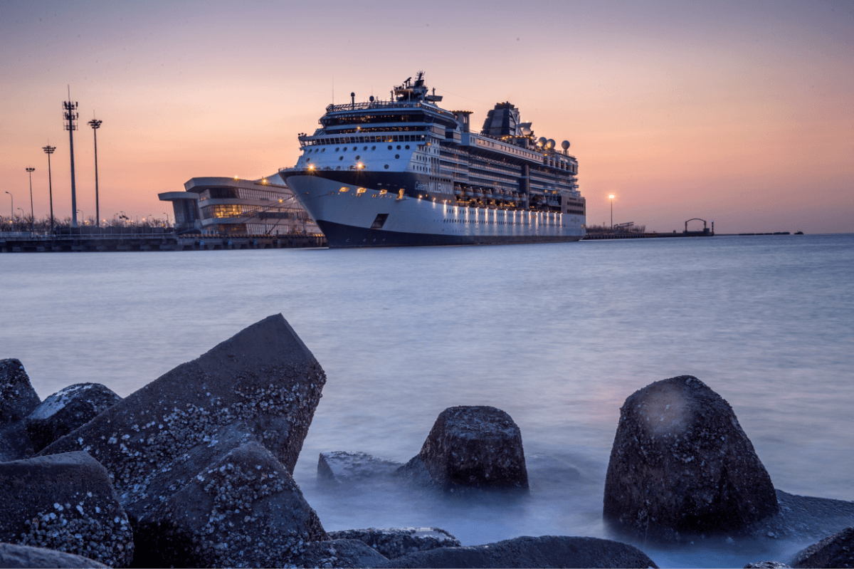 天津国际邮轮母港建有超现代造型的客运大厦,外形寓意为“海上丝绸”,气势宏伟,婉转流畅,拥有2个大型国际邮轮泊位和1个国际客货班轮泊位以及1个国内客货班轮泊位,码头岸线总长度达到1112米,可停靠目前世界最大国际邮轮。移动式登船廊桥,多形式的行李接取方式,体现了现代化邮轮码头的便利。
