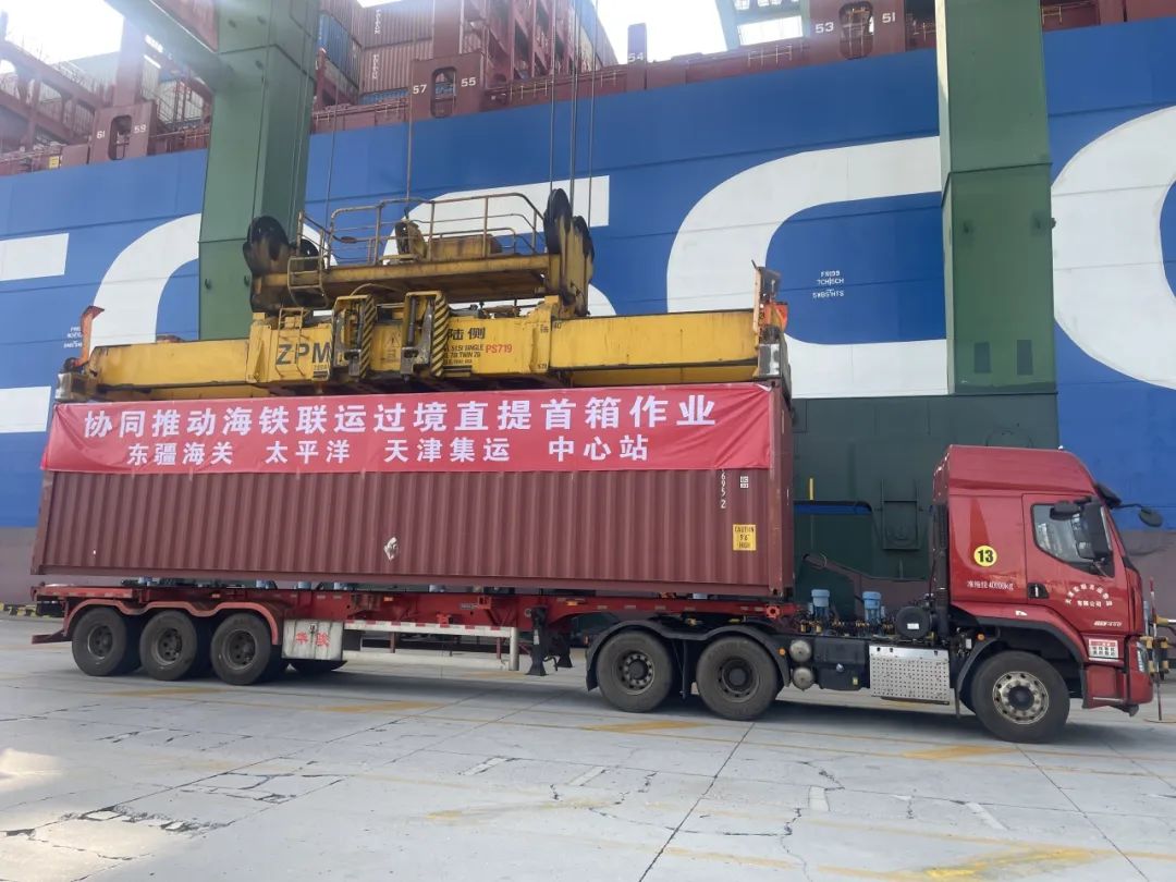 作业期间,为保障过境货物周转时效,东疆海关物流监管一科对海铁联运直提转场箱前置审核,太平洋国际公司与信息技术公司共同优化陆运协同平台,打通线上过境直提预约功能,同时依据船舶动态、进口积载和开线量科学测算CWP,向中铁天津集装箱中心站精准告知作业时间,提箱车辆到港即卸箱,实现了过境货物海铁联运的“无缝衔接”,有效提升了物流运输效率。